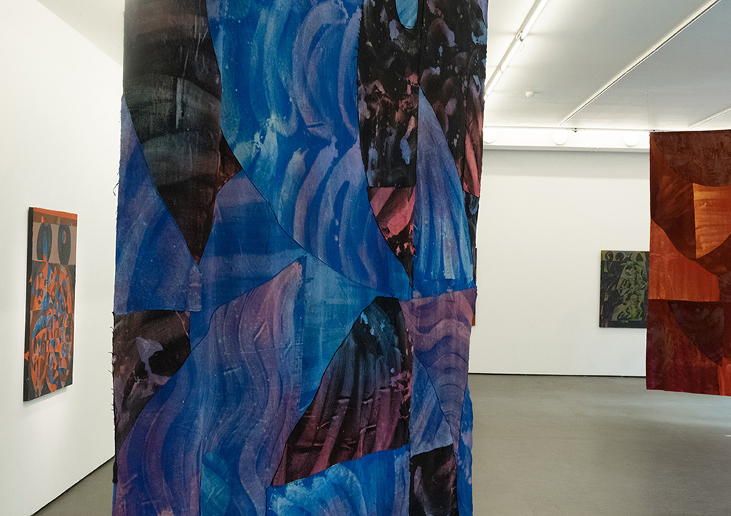 The exhibition takes up this symbol of liberty and addresses the tension that arises between two different forces: one that is liberated and chaotic, and the other tradition-bound and conical – the alien versus the familiar. The title of the exhibition, 1-2-2-2-1-2-2, is taken from the Phrygian musical scale in which 1 is a semitone and 2 a whole tone. The exhibition takes off from Vaittinen’s book Phrygian Mode, which he published in 2017 through his own Rooftop Press. The book, consisting of a series of charcoal drawings, is a rudimentary, abstract form study of the Smurfs – those small, blue, good-hearted figures from the TV series dressed only in white shorts and Phrygian caps. The exhibition gives this work a further spin, in which the entry point is a familiar figure abstracted almost to the point of unrecognizability, but which still retains some remotely identifiable features. The works in the exhibition are a cross between painting and collage. They have been made using a technique that Vaittinen has developed, and which makes use of the material qualities of acrylic paints. The other materials in the exhibition are linked to music and the club scene. Hanging from the ceiling are abstract, painterly, acoustic elements in Molton fabric, which are in direct dialogue with the soundwork being played in the space. The music in the soundwork is composed in the Phrygian mode and is played on a “sound system”, an audio installation with its roots in Jamaica, and which is tied to spontaneously arranged dance culture. For functional and logistical reasons these audio installations are constructed in a manner resembling brutalist architecture. The sound system in the exhibition was inspired by the original, but has been given a looser form. For the exhibition Vaittinen has also made a series of metal sculptures that take their form language from stage trusses – a construction element used in building stages for various types of event. The whole thing forms a mysterious space that might perhaps be a venue for secret gatherings, a place for sacred rituals, or a salon that opens us up to reflection and new insights. – Markus Åström